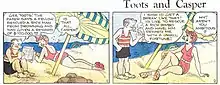 The same month he dropped Doc Attaboy, he began Toots and Casper for the American, using his wife, Matilda Katherine Crane Murphy, as the model for Toots. The strip was picked up by King Features Syndicate in 1919, and by 1925, it was being carried in numerous newspapers. He left New York and moved to California, living for decades in Beverly Hills. His hobbies of motoring and golf often interfered with his deadlines, and his business records from the 1930s revealed that he often was so late that he shipped strips east by air express. The daily Toots and Casper ran until 1951, with the Sunday strip continuing until 1956.[1]