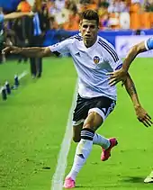 On 20 August 2014, Cancelo joined Valencia on a one-year loan with the option to purchase for €15 million.[10] Although his economic rights were owned by Peter Lim, a loan was arranged to take him to Valencia due to Lim's purchase of the latter club.[11] His La Liga debut occurred on 25 September, playing the entirety of a 3–0 home win over Córdoba;[12] He initially started as a substitute and appeared in the round of 16 round of the Copa del Rey in the first leg against Rayo Vallecano. He would also occasionally move to the right wing and later his good performances, specially against Levante on 12 April 2015, in which he was awarded the man of the match.[13][14] Throughout the season, he was used a second-choice right back behind Antonio Barragán, finishing the season with 13 appearances, across all competitions. Cancelo's performances helped Valencia reach Champions League, leading on 25 May, Cancelo agreeing to a permanent contract with the Spanish club until 30 June 2021, for a transfer fee of €15 million.[15][16][17][18]