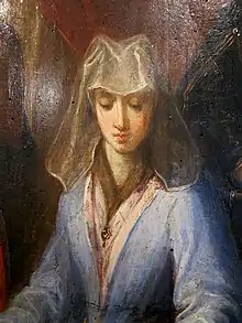 The Museum of the Hospice Comtesse has two tapestries of Guillaume Werniers, after drawings of Arnould de Vuez representing Countess Joan. One, made of wool and silk, showed Joan sat between her two successive husbands, Ferrand of Portugal and Thomas of Savoy, identified by their faces; it is marked "Joan of Constantinople, Countess of Flanders / founder of this house in 1233", which shows that the tapestry was made to the Hospice Comtesse. The other shows Count Baldwin IX, with his wife and two daughters, the future Countesses Joan and Margaret.[36] In the same museum, an anonymous painting of 1632, called "Foundation of the Notre-Dame Hospital", shows Countesses Joan and Margaret, surrounded by the Virgin, St. Augustine and St. Elizabeth of Hungary, as well as monks and nuns of the Hospice Comtesse.[36]