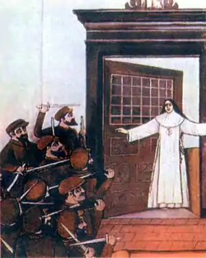 A solid colonial construction, still existing in the capital of Bahia, the Convent of Lapa consists of a cloister, whose main entrance is garrisoned by an iron gate. A group of soldiers tried to break into the gate while Joanna Angelica ordered the sisters to flee from the back.[5] In order to protect the cloister and integrity of the sisters, Angélica was placed as a last obstacle between the convent and the Portuguese troops.[6]