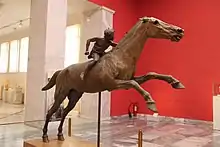 The Jockey of Artemision is a large Hellenistic bronze statue of a young boy riding a horse, dated to around 150–140 BC.[1][2] It is a rare surviving original bronze statue from Ancient Greece and a rare example in Greek sculpture of a racehorse. Most ancient bronzes were melted down for their raw materials some time after creation, but this one was saved from destruction when it was lost in a shipwreck in antiquity, before being discovered in the twentieth century. It may have been dedicated to the gods by a wealthy person to honour victories in horse races, probably in the single-horse race (Greek: κέλης - kēles).[1] The artist is unknown.
