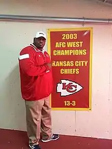 Hall next to the 2003 Kansas City Chiefs division championship banner