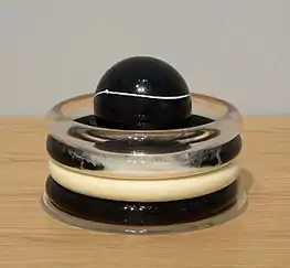 Ray's resin works convey his interests in science and spirit, euphoric perception, the individual human body and its systems, and the cosmos.[16][4] His later Rings and Spheres (1980–3) has been described as a work of painstaking craftsmanship whose seven deep-colored, opaque rings and spheres placed side-by-side conjure a wide range of metaphors.[30][20] Curator Ed Schad wrote, the sculpture "draws a humanistic line from the infinitesimal world of the atomic nucleus through the structure of the human heart to the patterns of stars and solar systems," with its seven pairings linking to that number's "mystical and numerological meanings, adding a cryptic edge."[30]