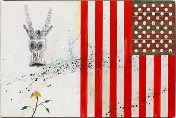 In the 1990s, Ray created assemblage-paintings that probed issues of identity, racial justice and inclusion through a fluid use of imagery—as symbols and formal elements—that subverted negative stereotypes and racial epithets.[5][27] One year after the Los Angeles riots sparked by the Rodney King police brutality case and acquittal, he completed a series including the works US and Blue Spade (both 1993); the former work's title refers to both the United States and the contradictions of the pronoun "us," which can function inclusively or divisively, as in "us vs. them."[18][4] The series juxtaposed symbols of freedom and equality and repression and protest: a gazelle mask symbolizing the African continent; kente cloth, a Ghanaian textile with significance to the West African diaspora that he used in place of an American flag's traditional blue field; flowers seemingly growing out of concrete; splashes of black paint suggesting stained urban sidewalks, anger or Abstract Expressionism; a whip painted white, a blood-red cross, and spade forms evoking a racial slur, card games and a tool.[18][4][5]