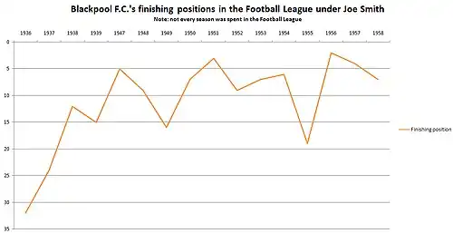 In August 1935, Smith was approached to become the new manager of Blackpool, in place of the departed Sandy MacFarlane, an offer he immediately accepted; a love of the seaside apparently being one of the main deciding factors. After a tenth-place finish in 1935–36, he led the club to promotion in 1936–37 with a second-place finish in the Second Division. He then secured the club's First Division status with mid-table finishes in 1937–38 and 1938–39. On 10 March 1939, Smith and club director Albert Hindley made the football headlines when they completed the £10,000 record signing of Jock Dodds from Sheffield United.[13] However, World War II ensured that Smith's big signing barely featured in the Football League, though he went on to score well over 200 goals at Bloomfield Road during the war.