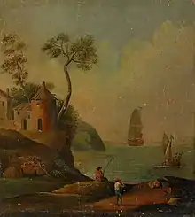 Sjölandskap med hus och figurer