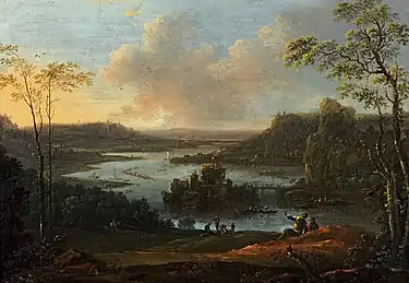 After Flemming's death in 1728, Thiele returned to Arnstadt. In 1729, he became court painter to Günther XLIII, Prince of Schwarzburg-Sondershausen,[3] but he also worked for the courts in Braunschweig and Kassel. In 1738, he was named court painter for King Augustus III of Poland and, in 1740, acquired the patronage of Heinrich von Brühl.[3] During this period, he received 1000 Thalers and free lodging for creating four landscape views of the Eastern Ore Mountains and Mount Oybin in the Zittau Mountains, as well as some of the first paintings of the Lößnitz region.[2]