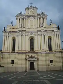 There are at least four churches in Vilnius reconstructed by Glaubitz, namely the Church of St. Catherine (1743),[2] the Church of the Ascension (1750), the Church of St. Johns, the monastery gate and the towers of the Church of the Holy Trinity. The magnificent and dynamic Baroque facade of the formerly Gothic Church of St. Johns (1749) is mentioned among his best works. Many church interiors including the one of the Great Synagogue of Vilna were reconstructed by Glaubitz as well as the Town Hall in 1769.