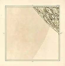 The complete title is Charte der Gebirge des Mondes nach eigenen Beobachtungen in den Jahren 1840-1874, which translates to "Chart of the Mountains of the Moon based on my own Observations in the Years 1840-1874". The chart is split into 25 sections based on Lohrmann's divisions. The relief is portrayed using hachure shading, with lines indicating slope. Schmidt makes no attempt to portray color, but uses darker shades for the mare regions. The wrinkle ridges have exaggerated slopes.