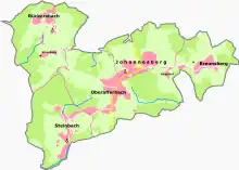 Johannesberg's Ortsteile are Breunsberg, Johannesberg, Oberafferbach, Rückersbach and Steinbach. Furthermore, three hamlets are to be found in Johannesberg: Rauenthaler Hof, Sternberg and Hagelhof.