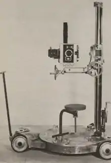 Arnold was elected to his first term as president of the American Society of Cinematographers in 1931, a position he would hold through 1937. He had previously been the treasurer of the organization.[24][25] During the year he became a major force in campaigning for Cinematographers to receive on-screen credit.[26] In 1932, American Cinematographer, the official magazine of the American Society of Cinematographers, decided to run a contest for the best amateur film, offering a $1000 prize. Arnold was selected to be one of the judges.[27] Late in 1932 Arnold was elected to the Technical Committee of the Motion Picture Academy (MPA).[28] Also in 1932, Arnold oversaw the creation of a standard testing practice by the ASC, whereby they would test all technical moving and still equipment. Equipment which passed the test were eligible to use the "Approved by A.S.C." tag in their advertising.[29][30] In the early 1930s, Arnold developed an attachment for the Mitchell Camera, which reduced the noise created during filming. It was a 48 cycle synchronous motor used to drive the camera, and it greatly reduced the vibration, and completely eradicated the noise of the motor. Along with a new version of the camera which was introduced in 1933, it was hailed as "...the greatest forward step in recent years." The combination of the new camera with the Arnold motor allowed the camera, without a hood (or blimp), to be used as close as a yard from the microphone.[31] Another invention of Arnold's in the early 30s was a rolling tripod, which would be further refined by Mole-Richardson company, which gave it the name, the "Mole-Richardson rolling tripod".[32][33] Arnold also invented the MGM camera crane, which was a substantial improvement over prior versions. it was about half the size of earlier versions, and 1/17 as heavy, as well as cutting costs by 90%. It elevated to 26 feet, weighed 3300 pounds, and cost $3,500. The crane could swing through a complete horizontal circle, while the arm could rotate 90 degrees. During this same period Arnold also designed the "rotambulator", a radically new design of camera dolly, which allowed a stable platform to move from about 18 inches off the floor to a height of eight feet. The operator could also rotate the entire assembly through a complete 360 degree circle.[34] Arnold was also an avid 16mm camera fan, and would share his expertise with anyone who showed an interest. One of those he taught was Clark Gable.[35][36] With the passage of the National Industrial Recovery Act of 1933, the National Recovery Administration was created, and part of its responsibilities included the creation of a motion picture code. At the hearing held in Washington D.C., Arnold was included as one of a long list of speakers who had requested to be heard.[37] His attendance at the hearings in Washington caused him to miss the wedding of his good friend, Lee Garmes, for whom he was supposed to be the best man.[38] By the end of 1933, Arnold's rotambulator was in use at several studios, replacing the tripods, dollies, and light cranes.[39]