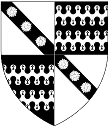 Arms of Cary: Argent, on a bend sable three roses of the field[1]