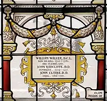 Stained glass by C.E Kempe in the Grundy Library, Abingdon School containing the name of John Clarke