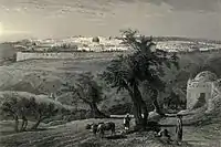 The sketches that formed the basis of Picturesque Palestine were compiled during Woodward and Fenn's two joint tours of Egypt and the Levant in the winters of 1877–78 and 1878–79. The two trips are documented in his correspondence with Woodward's wife and his mother. The pair received special permission to sketch inside and under the Mosque of Omar (the Dome of the Rock), although Woodward compared the streets of Jerusalem with the "dirtiest alleys of Baltimore". Oppressed by the heat, glare, and barrenness, the best he could say about the shore of the Dead Sea was "I suppose it is not so bad it couldn't be worse". Nazareth was "the worst",[2] while he was most impressed by the Syrio-Roman ruins at Baalbek.[27] In 1879, he returned to New York and spent much of the next three years readying the illustrations for print.[3] The works were hugely successful, with Woodward and Fenn earning $10 000 a year each in royalties on the Holy Land volumes.[2]