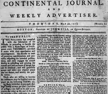 Continental Journal no.1, May 30, 1776; "printed by John Gill in Queen-Street," Boston