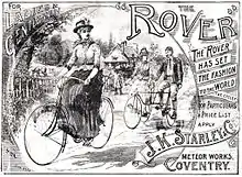 In 1885, Starley made history when he produced the Rover Safety Bicycle.[8][9] The Rover was a rear-wheel-drive, chain-driven cycle with two similar-sized wheels, making it more stable than the previous high wheeler designs. Cycling magazine said the Rover had "set the pattern to the world" and the phrase was used in their advertising for many years.