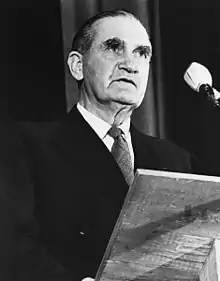 In 1958, following Fadden's retirement, McEwen was elected unopposed as leader of the Country Party. Under the Coalition agreement, he thus became the de facto deputy prime minister, and was afforded a free choice of portfolio.[14] Fadden had been Treasurer, but McEwen somewhat unexpectedly chose to continue on as trade minister. This allowed Harold Holt to become the first Liberal MP to serve as Treasurer; since then every Treasurer in a Coalition government has been a Liberal. McEwen nonetheless had considerable influence in cabinet. He and his party favoured interventionist economic policies and were opposed to foreign ownership of industrial assets, which placed him frequently at odds with his Liberal colleagues.[15] In 1962, a dispute between McEwen and Assistant Treasurer Les Bury ended with Bury being sacked from cabinet.[16] His stature eventually grew to the point where he was considered a potential successor to Menzies as prime minister. An opinion poll in December 1963 showed that 19 percent of Coalition voters favoured McEwen as Menzies' successor, only two points behind the poll leader Holt.[17] By December 1965, this number had risen to 27 percent, compared with Holt's 22 percent.[18] McEwen's cause was championed by a number of media outlets, including The Sun and The Australian. Nonetheless, he had few supporters within the Liberal Party, and it was generally held that he would have to become a Liberal if he were to lead the Coalition, which he was unwilling to do.[19]