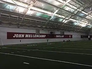 The John Mellencamp Pavilion is the primary indoor athletics training facility of the Indiana Hoosiers's football program. It was dedicated on April 12, 1996, following a donation of $1.5 million from singer-songwriter John Mellencamp, to facilitate the project. The indoor practice facility contains a regulation-sized football field, featuring a Sportexe Momentum 41 artificial surface which was installed in 2007. The field can also accommodate field hockey, soccer, baseball, softball and golf.[1][2]