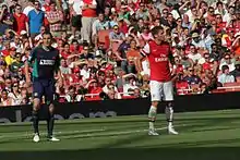 O'Shea captained United for the second time against Birmingham City in their first game of the 2009–10 Premier League season.[22] He celebrated his 350th appearance fittingly by scoring his first league goal in over two years against Stoke City on 29 September 2009, firing in a header in a 2–0 win.[23] He captained the team for the third time in the second leg of United's 2010–11 UEFA Champions League semi-final victory over Schalke 04.[24] O'Shea made 393 total appearances for Manchester United.[25]