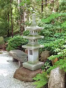 Of special interest in the garden are the winding stepping-stone walkways and gravel paths, stone lanterns, bamboo groves, a variety of mosses and a waterfall emptying into a koi pond.[12][13][4][5] The bamboo is used for fences, for bottom of the tea house and as a water pipe.[9] Japanese maples were planted as well as other Japanese trees, shrubs and groundcovers.[9] In addition, there are more than 11 species of moss.[10]