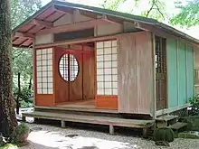 Upon return from a trip to Kyoto, Japan in 1960, John Portner Humes, a lawyer then ambassador, began work on a Japanese garden.[1][2] As a lawyer Humes worked for Mitsubishi and traveled to Japan for business.[3] The garden was designed between 1962 and 1965 by Douglas and Jone DeFaya who used Japanese shrubs, trees and ground cover as well as symbolic placement of stones.[4][3] The focal point of the garden is an imported tea house, in the design of the Ashikaga period, that was acquired in 1962.[5][3] The sandalwood tea house was prefabricated in Taiwan and featured straw matting and rice paper door panels.[6]
