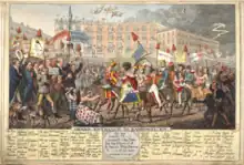 Satirical print of 1821 showing Caroline of Brunswick on an ass at the centre, and John Page Wood to her left, mounted and holding her hand, in a jester's costume[1]