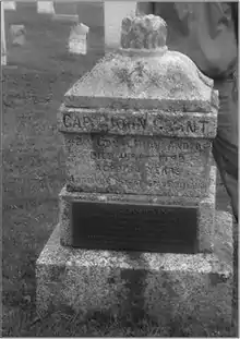 He arrived in Nova Scotia on the transport HM Berwick, 1 July 1783 after evacuating his home in New York.[15] He brought to Nova Scotia 7 of his children and 9 slaves, all of whom were buried on his property. Captain John Grant died in Summerville in 1790 at the age of 61. The Grant homestead was on what now is called Loyal Hill.