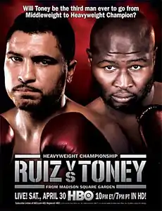 Toney, the former middleweight and super middleweight world champion, had been fighting in the cruiserweight division for some time when he faced off against previously unbeaten Vassiliy Jirov for the IBF cruiserweight championship. Toney knocked down the four-year reigning champion in the final round en route to a unanimous decision victory, taking a major world title in a third weight class. Shortly thereafter, Toney moved up to heavyweight and took on Holyfield his debut in the class, scoring a knockdown in the ninth round and forcing Holyfield's corner to stop the fight. After trying to pursue a fight with Jones, who had handed Toney his first professional defeat, he elected instead to fight Ruiz after taking a tuneup against Rydell Booker, which he won in a lopsided unanimous decision.[2][3]