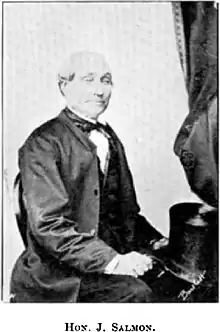 Salmon was a member of the Legislative Council that was established through the Constitution Act. There were 16 initial members in the upper house who first met in May 1854 and Salmon was 1 of the 6 Aucklanders who had been appointed.[9] His membership lasted from 26 May 1853 to 21 December 1868, when he was disqualified for absence.[10] He stopped attending the council's sessions when parliament moved to Wellington.[3]