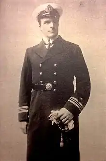 Wilson signed up as a navy officer cadet at Britannia Royal Naval College on 15 September 1898, and on 14 January 1900 was gazetted midshipman aboard HMS Canopus, on which he served for three years.[4] On 12 July 1904, he was promoted to sub-lieutenant, with seniority backdated to 10 March 1903;[5] and on 5 January 1905, to lieutenant, backdated to 10 March 1904.[6] He served in the submarines for six months, before joining HMS King Edward VII, the flagship of Sir Arthur May. In 1906, he went to HMS Vernon, where he undertook specialist torpedo training, and in the years running up to the First World War, he served aboard HMS Talbot, HMS Formidable, HMS Superb, HMS Dreadnought, and finally, from 1913, HMS Indefatigable.[4]
