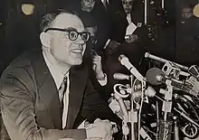 After the trial on November 23, 1954, the Chinese News Agency announced that it had captured and tried two American spies, letting the United States and Downey's family know he was alive.[4] The Eisenhower administration immediately protested.[8] Because their status as CIA officers was a secret, the U.S. Government claimed Downey and Fecteau were civilian employees of United States Army.[8] This complicated the efforts of U.S. officials, family members, and others to press for the men's release or even to make their plight widely known.[4] When Chinese Premier Zhou Enlai expressed willingness to discuss Downey and Fecteau's release and invited their families to visit, U.S. Secretary of State John Foster Dulles rejected his offer, forbade visits by their relatives, and claimed China had committed the "reprehensible" crime of holding Americans on "trumped up charges."[3] Zhou even offered to release the two men if the United States would admit they were CIA agents; the United States declined to respond.[3]