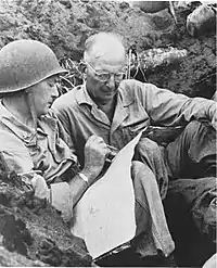 Colonel Selden was succeeded by Colonel Oliver P. Smith on March 1, 1944, and subsequently was appointed Chief of staff of 1st Marine Division under the command of Major General William H. Rupertus. In this capacity, Selden participated in Battle of Peleliu and was decorated with his second Legion of Merit for his efforts.[2] He was transferred back to the United States in November 1944 and appointed Chief of Staff of Marine Training and Replacement Command in San Diego area under Major General Charles F. B. Price.