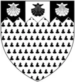 Arms of Taylor: Argent guttée-de-poix, on a chief indented sable a pale between two escallops of the first charged with an escallop of the second[1]