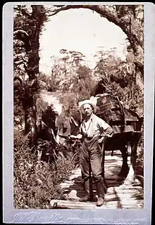 J. W. Beattie standing and holding a laden pack horse on a bush track. Sepia-toned cabinet card with photographer's signature embossed L.L. Allport Library and Museum of Fine Arts, State Library of Tasmania.