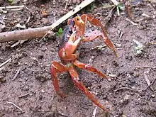 Johngarthia lagostoma is a species of terrestrial crab that lives on Ascension Island and three other islands in the South Atlantic. It grows to a carapace width of 110 mm (4.3 in) on Ascension Island, where it is the largest native land animal.[2] It exists in two distinct colour morphs, one yellow and one purple, with few intermediates. The yellow morph dominates on Ascension Island, while the purple morph is more frequent on Rocas Atoll. The species differs from other Johngarthia species by the form of the third maxilliped.