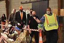 In January 2021, Olszewski opened the county's first vaccination clinic at the Maryland State Fairgrounds.[68] Governor Hogan called the Fairgrounds vaccination clinic the "best operation in the state" and later announced in March 2021 that it would be converted to a mass vaccination site in partnership with Baltimore County.[69] In June 2021, after Governor Hogan lifted most of the state's COVID-19 restrictions, Olszewski said he would allow the county's state of emergency declaration to expire on July 9.[70] In August 2021, Olszewski issued a new indoor masking requirement and declared a new state of emergency following a spike in cases of the Delta variant.[71][72] In December 2021, Olszewski declared a new state of emergency and again required indoor masking amid a surge in cases of the omicron variant.[73] On February 14, 2022, Olszewski announced that the county would lift its indoor mask mandate and end required COVID-19 testing for unvaccinated employees.[74]