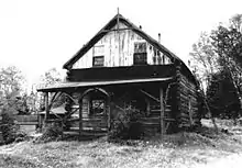 Two buildings, the hotel and one cottage, remain on the site; the remainder were either dismantled or burned, but some archaeological features remain.[6] The main Johns Hotel is a 1+1⁄2-story structure built of round logs with cement chinking.[7] It was originally a single story building; the upper portion was added later.[7] It has six rooms and a gabled roof with vertical board gable ends, and six-light and six-over-six horizontal sliding windows.[7] A single-story addition with shed roof is located to the rear.[7] The cottage is a 1+1⁄2-story building built with round logs with cement chinking.[8] It has a gabled roof with shingled gable ends, and 6-over-6 windows.[8]