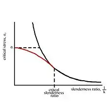 There is a transition point on the graph of the Euler curve, located at the critical slenderness ratio. At slenderness values lower than this point (occurring in specimens with a relatively short length compared to their cross section), the graph will follow the Johnson parabola; in contrast, larger slenderness values will align more closely with the Euler equation.