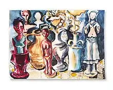 Beginning a period of extensive travel and journalistic work in 1985 Stahl took up aquarelle and collage as a more portable medium suitable for recording the variations of color and light in distant lands. While conducting ethnographic fieldwork in West Africa in 1991, she began collecting colons, vernacular wooden sculptures depicting African men and women in non-traditional jobs as seamstresses, dentists, attorneys, medical doctors, soldiers, filmmakers, race car drivers, and colonial administrators.[3]
