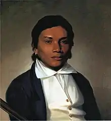 While on his tour of the U.S., American artist Philip Tilyard made a portrait of Jonathas Granville, which is now on exhibit at the Baltimore Museum of Art. This is an canvas oil painting. Its measurements are height: 50.8 cm (20 in.), width: 48.26 cm (19 in.). The colors are more real than in any other visual representation we have of the time, and in this point it correlates with the way people described him, but the rest of his appearance here is less accurate. The intention of the artist was not to present him as he really was, but to show him in a regal and noble demeanor, which was part of the exoticism of the orientalist movement of the time.[10][11][12] He never wrote or talked about this portrait, but he mentioned how he was being paraded in the U.S as a strange beast, being asked to talk and showing himself to others in an exotic manner. "They look at me as a curious beast, given meetings to hear me speak, so I chattered like a magpie."[13]