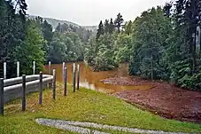As a result of the flood, a new stream was formed within the area of the retention basin, causing significant damage to the surrounding forest as it carved out a new path.[11]