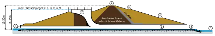 Prior to backfilling the dam, a 141-meter-long culvert (1) was built in the central part of the dam to accommodate the Jonenbach. This concrete culvert was built in stages of 7.5 meters in length, with an outer diameter of approximately four by five meters. This was followed by the spillway (2), also made of concrete, with the almost 17-meter-high, shaft-shaped inlet structure that opens into the culvert.[6] The intermediate space below the spillway was underpinned with concrete.[4] Finally, the earthen embankment with a dam volume of 123,000 cubic meters was backfilled. The fill material for this was supplied in part from the nearby N4 construction site in Knonaueramt.[2]