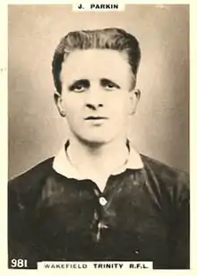 Jonathan "Jonty" Parkin (1894–1972) was an English professional rugby league footballer who played the 1910s, 1920s and 1930s. One of the nine inaugural inductees of the Rugby Football League Hall of Fame, he toured Australia three times, twice as captain of Great Britain, earning 17 Test caps. Parkin played at stand-off or scrum-half, and also captained England for whom he made 12 appearances, as well as 17 for Yorkshire.[3][4][5] Parkin gave the Wakefield Trinity club seventeen years' service, including victory in the 1924–25 Yorkshire Cup.