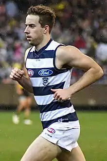 Jordan Cunico (born 7 May 1996) is a professional Australian rules footballer who played for the Geelong Football Club in the Australian Football League (AFL). He was drafted by Geelong with their fourth selection and fifty-ninth overall in the 2014 national draft.[1] He made his debut in the two point win against Port Adelaide at Simonds Stadium in round ten of the 2017 season.[2]
