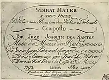 Stabat Mater by José Joaquim dos Santos, cover page. Published by the Real Fábrica da Musica, Lisbon, 1792. Collection of the Library of the Ajuda National Palace, Lisbon.