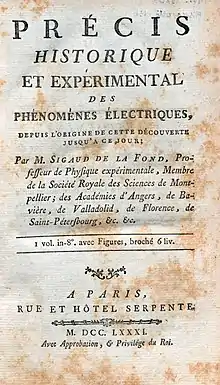 - Précis historique et expérimental des phénoménes électriques, depuis l'origine de cette découverte jusqu'a ce jour (in French). Paris: Gaspard-Joseph Cuchet. 1781.