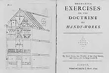 Moxon's Mechanick exercises was published in parts between 1677 and 1684. It was completed in two volumes: the first giving instructions on metalworking, woodworking, brick-laying and sundial-construction, and the second (issued 1683–1684) providing a detailed series of instructions for printers, including typefounding, composition, press-work etc., which have given printing historians much (probably idealised) information on the working practices of hand-press period printing-houses.[2]