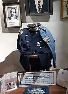 There is also an exhibit dedicated to Petrosino in the Italian American Museum, at 155 Mulberry Street in Manhattan's Little Italy. The exhibit pays tribute to him by displaying memorabilia documenting his career. It includes photographs, a vintage LP record, an original Black Hand letter, as well as both artwork and a comic book about his life. A plaster cast from the original 2014 bronze relief in Petrosino Square was donated to the museum by its creator, artist Carter Jones.