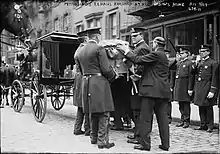 Funeral rites for Petrosino were performed in Palermo, after which his body was sent to New York aboard the English S/S Slavonia, arriving April 9. On April 12, 1909, funeral rites were conducted in St. Patrick's Cathedral, with over 200,000 people taking part in the funeral procession.[24] New York City declared the day of his burial a holiday to allow its citizens to pay their respects.[25] A pillar topped with an elaborate bust, inaugurated a year after his death,[26] marks his gravesite in Queens, New York, Calvary Cemetery.[27] Multiple organized crime notables are buried there, including members of the Morello crime family which he investigated, (e.g., Giuseppe "Peter" Morello (the Clutch Hand), Ignazio "Lupo the Wolf" Lupo (1877–1947), and the Terranova brothers (who rest in bare graves).[28]