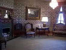 The John P. Nash memorial library is located at the top of the stairwell on the house's second floor. Originally a bedchamber, the room was renovated in 1995 by donations from Nash's family. The room contains a bay window, mantel, and a marbel wash basin behind a paneled door.[1] The Schwartz Ivories Room was once a dressing or servant's room. It now contains the Simon Schwartz Collection of Chinese Ivories, which was donated to the museum in 1973.[1] The collection contains items from over 300 years of history including over 40 rare pieces.[1] The Porcelain Room houses a collection of hand-painted porcelain sculptures created by Boehm Studios.[1] Mrs. Guido Rahr's collection of dolls are displayed in the Doll Room. They were acquired in her travels around the world. The items are ceremonial, folklore, and popular figures from their country.[1] Furnished dollhouses in the room were donated by Amy Brady. The dollhouses contain 1930s furnishings from Marshall Fields. The Doll Room also contains the furnishings from a Victorian dining room.[1] The Kamogawa Room contains a collection of gifts from Manitowoc's Japanese sister city Kamogawa.[1]